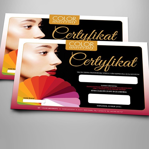 Certyfikat zawiera indywidualny numer licencji, który uprawnia do świadczenia klientkom profesjonalnego poradnictwa kolorystycznego z wykorzystaniem naszych materiałów.
